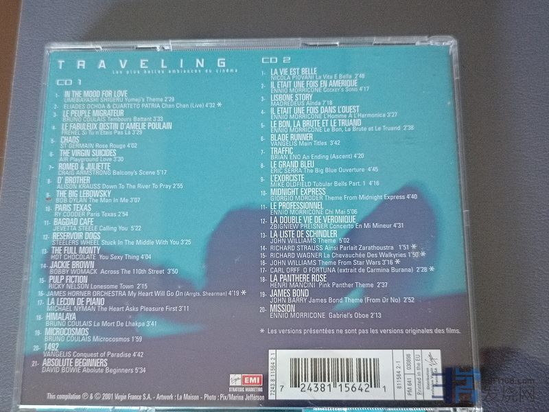 上面一图的唱片是VIRGIN公司出的一套两张电影音乐。非常好听,场面宏达,音场极为开阔。CD1第一首是王家卫导演张曼玉、梁朝伟主演的《花样年华》的主体曲,当年在电影院看完这出戏,我印象最深的是这段音乐,找遍电器城的CD店都找不到原声碟。没想到这张唱片第一首就是。听着就想起电影中一幕幕张曼玉不段换不同花式的旗袍,扭动身躯,妩媚地走路,上楼,渗透着成熟女人的**的镜头画面。CD1还有范吉列斯的1492主题曲音乐,铁达尼号,罗密欧与朱丽叶等电影音乐。CD2有好几首莫尼康的电影音乐,还有粉红豹,辛德拉的名单、星球大战、查拉图如是说,飞翔的女武神,布兰诗歌等等。音效之好,我列为我自己的五星唱片。每一面都超过70多分钟。我拿手机录了两段给老曹,可惜手机收音太差,几乎没有低频。老曹倒过来发了两段客户用不到3000元版本的CL3000推高灵敏度大箱的视频给我,哗录得非常棒!没想到普通的版本也表现这么优异,有机会真想拜访一下那位客户。