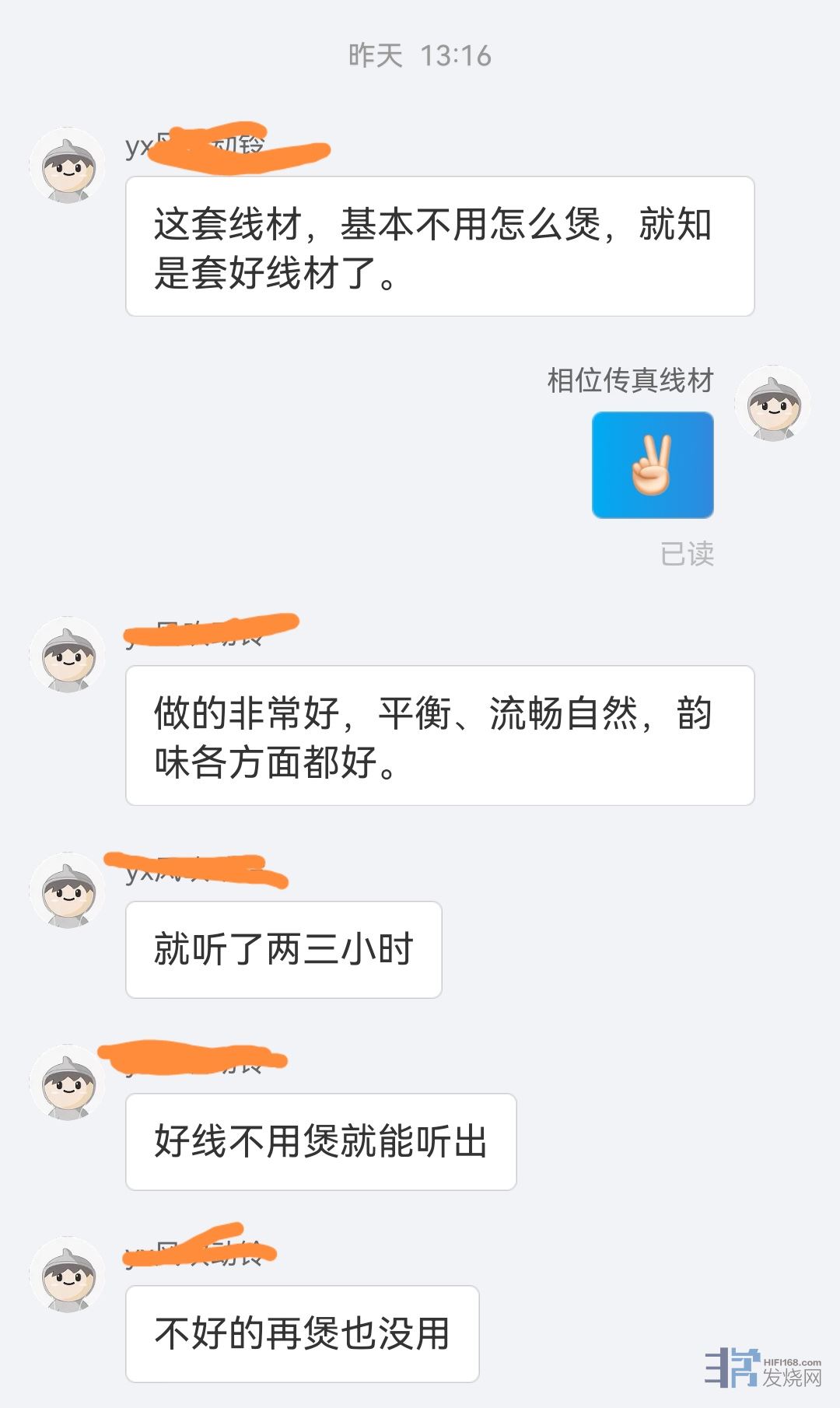 下面说的感受前提是没有煲,直接接上的感受,提升就马上一耳朵分辨出来。素质是打了折扣的,褒熟的状态应该强烈可期!先接入信号线。信息量更丰富什么的就不说了,在我的系统这里最突出的印象是有一种流水的流畅鲜活感,源源不断,系统完全放松,自然流淌的状态。活水不断;缺点也有:略慢,结像差点儿,变大且纵深略扁平化并向后退了点儿,多了些许箱声;换上音箱线,一般的优点也就不多说了,透明清甜自然流畅。刚才说信号线的优点音箱线全有。然后刚才说的信号线带来的结像和箱声问题,换上音箱线后又神奇“消失”掉了,声音又回到了我熟悉的原来正常声底上来,但这时候这套线比原系统带来的好处就是延伸更广,更丰富更自然流淌。。。总结:感觉音箱线的素质更胜信号线,信号线的所有优点就是音箱线的优点,信号线的短板音箱线却没有。虽然这俩不应该放在一起说。。。总之很超值,满意。供您参考。电源线还未试。