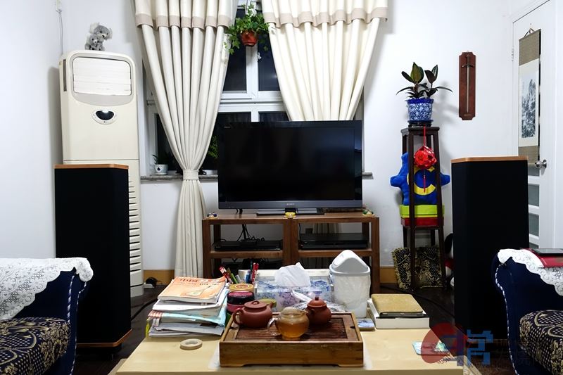 须:是的,还好不是落地窗,不然的话低频就没了。我听的时候会放下双层窗帘,但是楼上楼下有邻居,儿子也要学习,会受到很多限制,所以,我的主战场是在隔壁小区的商务楼,我在这里有一间独立的听音室,面积30平米不到,但层高有3.4米。由于是有两套音响系统,而且彼此之间有连接(共用转盘、数播),所以只能横放,听音位贴墙。为了避免“乒乓效应”,聆听位置后墙几乎全吸音。为了避免全吸音带来的副作用,经过反复比较,发现在两只音箱的正对面放了两盆散尾葵做扩散效果不错。音箱离后墙约1米不到、相距2米、与人2.5米。音箱后墙作全扩散,地上铺地毯。由于房间层高较高的缘故就没做天花板处理。墙角还有2个塞满被子的大箱子吸收低频。此外还拉了音响专线,用的是德国Doepke空气开关、63A的“熊猫”牌4平方多股护套线,我不喜欢单支硬线的声音。