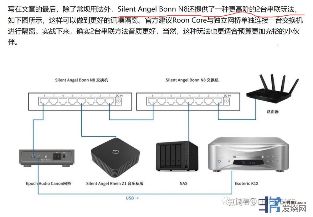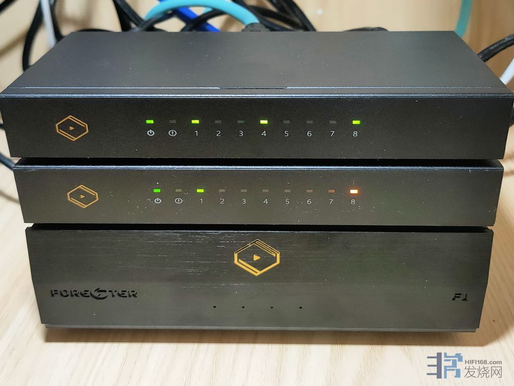 有些烧友非常排斥数字音乐,确实,目前网络上的数字音乐,来源良莠不齐。尽管如此,本人是数字无损音乐的坚定支持者,先后收了两台数字播放机作为音源,分别接入两套hifi系统,的确非常方便,目前用一台4x18TB的威联通NAS,专门存储多年收藏的数字音乐。 下图是,Silent Angel仙籁N8网络交换机两台串联,搭配同厂线电