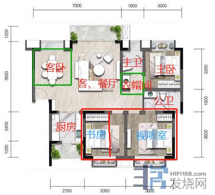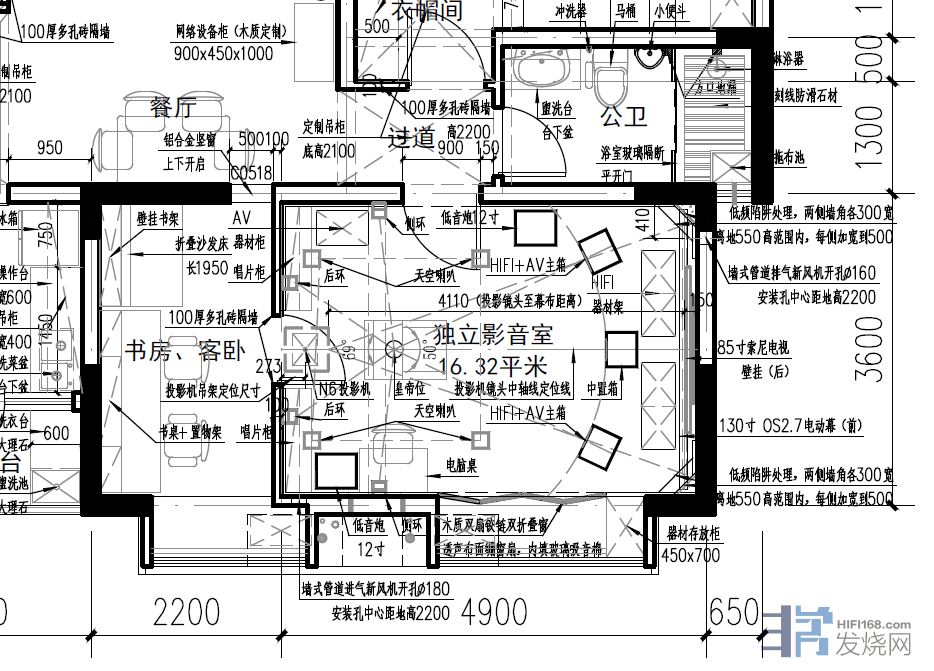 本人是注册建筑师,新房装修时,对原有户型内部,彻底做了重新的设计和改造:把两间卧室打通,2/3空间做独立视听室(方便本人HIFI&AV双修),1/3空间做小书房,并对视听室6个面,进行了吸隔音处理,等有空,专门开一个帖子,讲述这一年多的辛苦装修过程