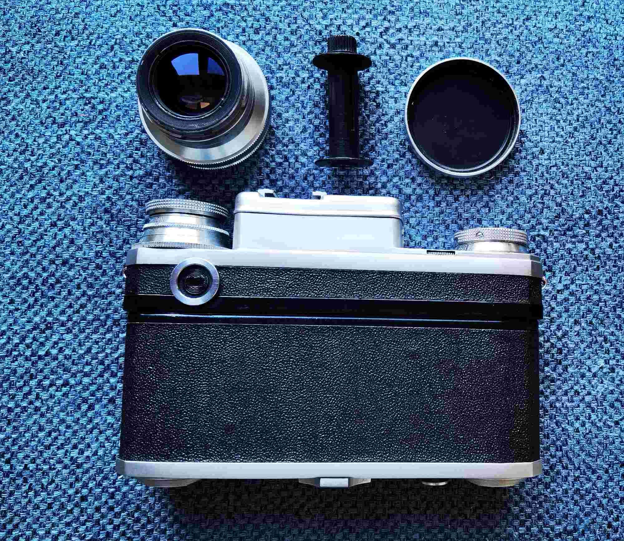 本机产于1953年,机顶A编号,稀有早期蔡司生产线产品,几乎跟康太时一样,是对战前的“CONTAX"(康太时) 照相机的原版仿制,机身及镜头全新或近全新,机身漆面几乎完好,几乎无使用痕迹,镜头甚净,在强光照射下可见微尘,实属难得。除机身及镜头外,尚有:好品原厂机套及机带,全新或近全新原厂金属片轴(带厂标),全新或近全新原厂镜头盖,说明书。