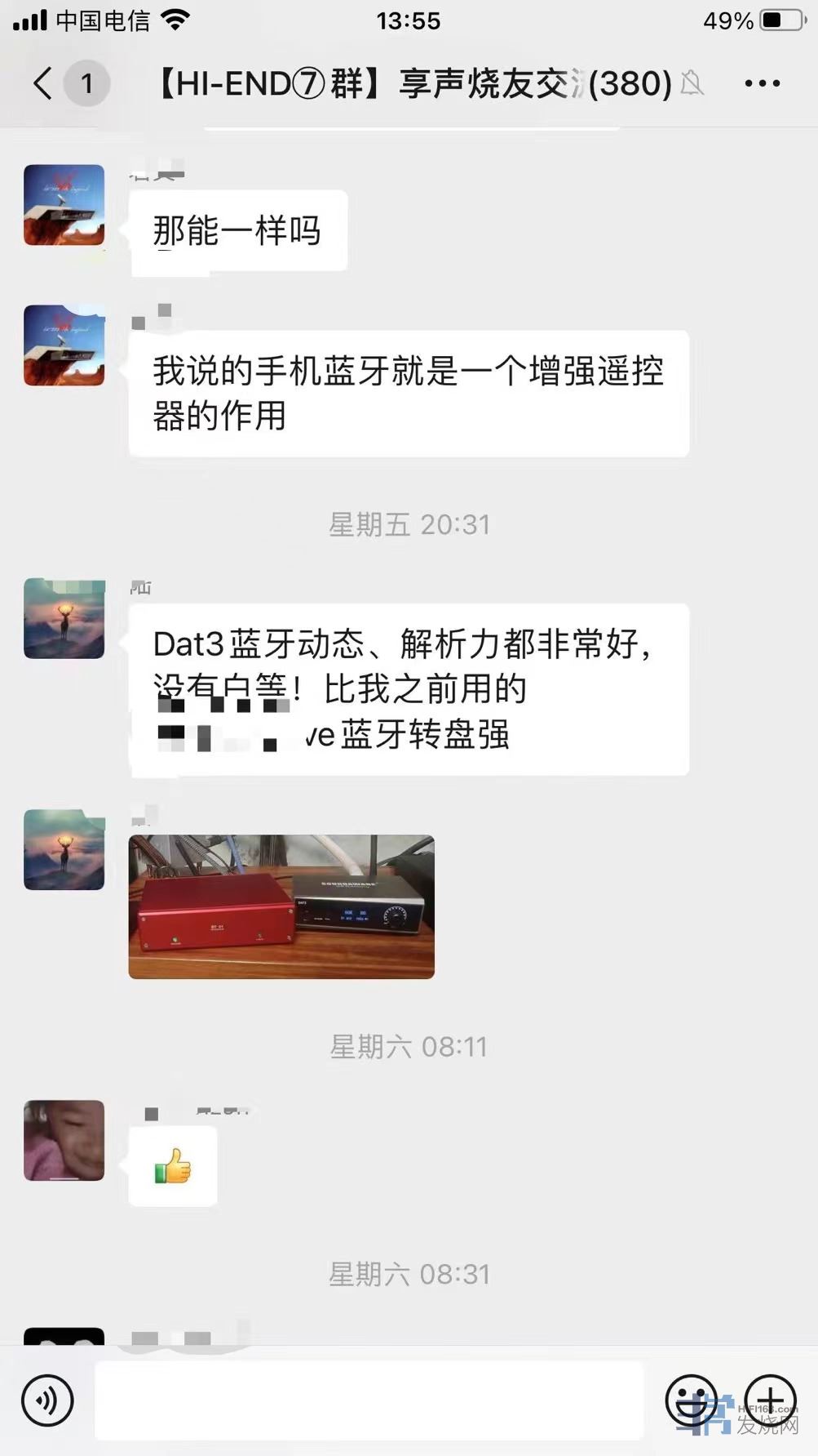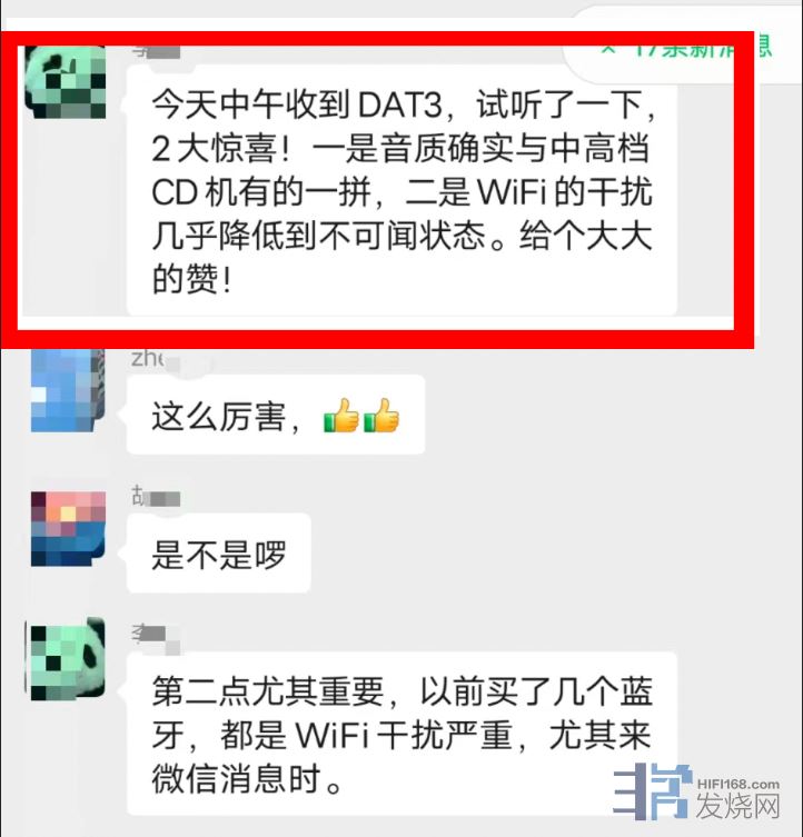 在群内,一位朋友的音箱外形颇具特色,被称为大狗音箱。其他群友对 DAT3 的实际使用体验也充满好奇,紧接着便询问其是否满意。这位朋友表示,大狗自带的蓝牙效果不佳,较为模糊,但当使用 DAT3 后,却有了焕然一新的感觉。“焕然一新”这个评价无疑是相当高的。