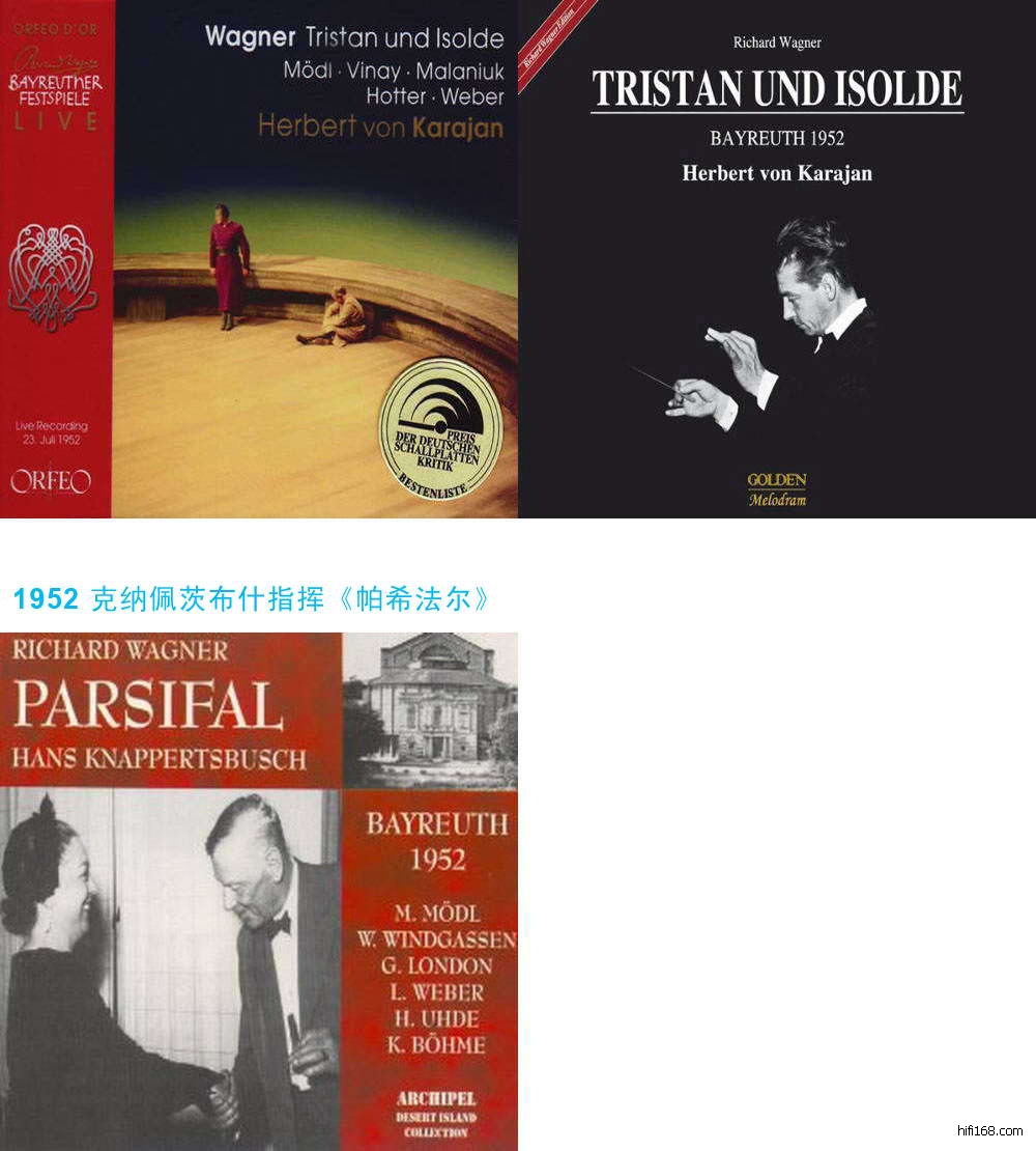 1952-195419521952 卡拉扬指挥《特里斯坦与依索尔德》 July 23, Tristan und Isolde - Mödl, Malaniuk, Vinay, Hotter, Weber, Uhde – Karajan issued on CD by Orfeo on C603033D and by Walhall on WLCD0001 and by Urania on URN22365 Aug 1, Parsifal - Mödl, Windgassen, London, Weber, Uhde, Böhme – Knappertsbusch - issued on CD by Golden Melodram GM 1.0051 and by Archipel on ARPCD01121952 凯尔伯特指挥《尼伯龙根指环》