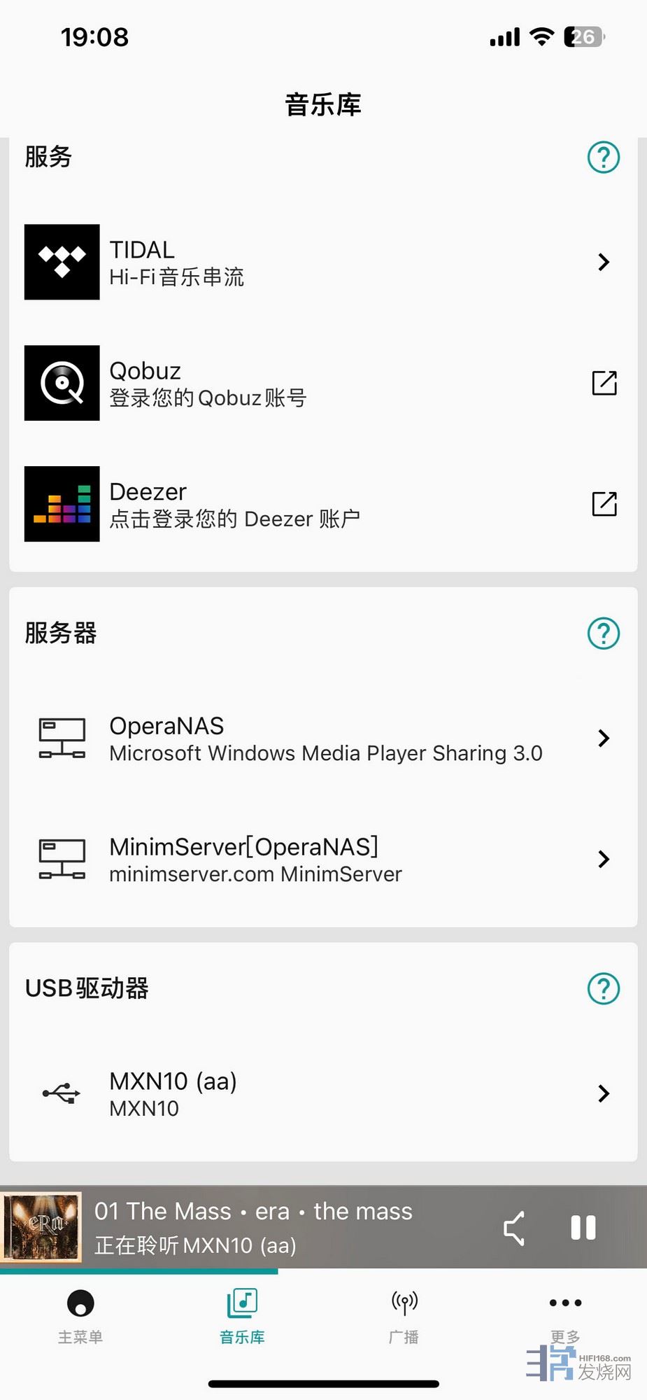 mxn第一次连接,建议用有线网络连接,连接好后,打开APP,主页最下方第一项是主菜单,主要是设置mxn10,第二项是音乐库,可以连接U盘、NAS、tidal等。