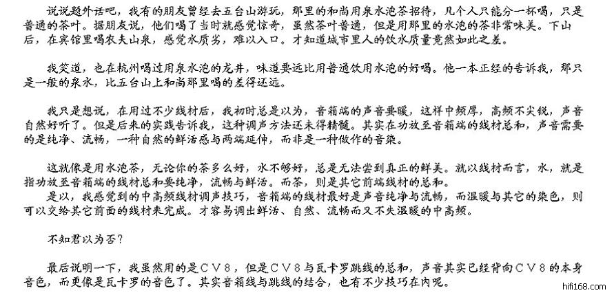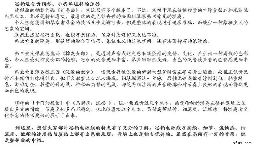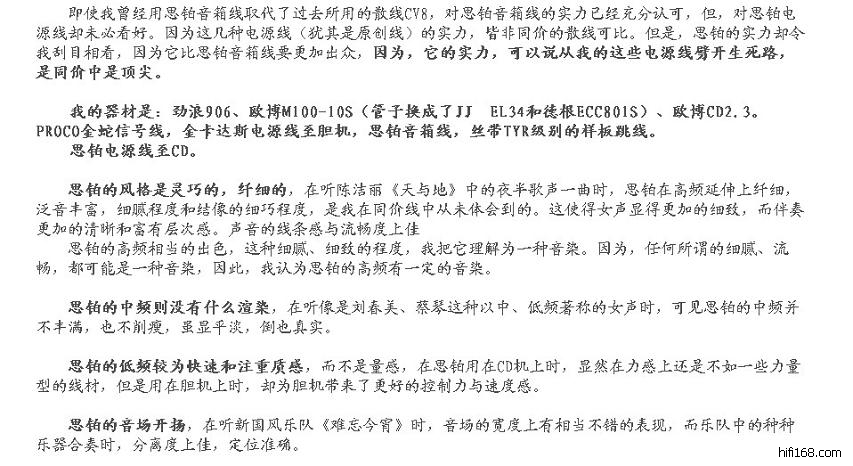 一曲熟悉的“王菲-矜持”响起,一开声就让我爽YY了第一感觉是背景纯净了,第二感觉是我的AE200竟然有点飘逸的感觉了!比当初换瓦卡罗跳线时的感觉还要明显。我的AE200一直都觉得高频暗缺乏感情,换了AQ的信号线和瓦卡罗的跳线之后有了改善不过还是不满意,这根电源线一接上去,一曲王菲的矜持让我感动得连续听了3、4次,那个高频得空气感和飘逸感比我换瓦卡罗跳线的改善还明显。背景很干净很干净,整个音场都变得很舒展,层次分明,期待煲好之后会有更好的表现。200块的定价实在有点对不起这根线,外观和做工都是一流,除了线太粗而有点硬之外没什么缺点了。刚刚接上还没煲开感觉已经很不错了,希望煲开后有更加好的表现。最后忍不住再和Z兄订多一条电源线接到我的AUDIO REFINEMENT功放上。忘了说一下缺点,线身太硬了,不太好接,勉强插上去后弄得整个排插都翘起来了。II代产品线身相当软,改掉了一代产品的不足