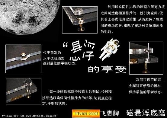 Hi-Fi中的LP.CD.解码,前置放大机,家庭影院中的DVD等高级音响器材,均存在其内部机械转动构件,而各碟片类音响制品中的音、视频信号轨迹又及其纤细,任何轻微的震动都会对音、画质产生巨大的影响。如果您配置了一套高品质的音响器材,却聆听不到Hi-End所具有的绝佳音色,而是声场混浊、音质粗糙、画质冗杂的效果,您是不是为此而感到遗憾呢?如何避免外界震动对音响器材的影响,不与外界环境接触呢? Flying eagle HIFI音响磁悬浮避震底座(垫)(产品专利号:ZL200420063215.X)利用同极性强磁场产生排斥力的工作原理,将音响器材“浮”起,“悬”在空中,有效避免震动对音画质素的影响,使音响器材与碟片得到淋漓尽致的发挥。标配规格:悬、底板均为进口亚克力板,悬板460mm*410mm*20mm,底板490mm*440mm*20mm自重13公斤标配承重量:20kg,高承重量可量身定做!先款后货。邮费自理。中国工商银行:帐号:9558 8009 1210 0132873 王明。有兴趣的烧友电询:013604550622或站内短信,或告知电话,必复!