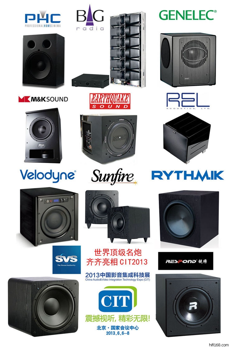低音炮在家庭影院系统中是一个重要角色,担当着营造低频效果与影院芬围的目的。它需要具备强劲能量输出,又需要足够低的失真和优秀的耐用性,这样才能为观众提供源源绝的震撼力。在即将于6月6-8日在北京举行的CIT2013大展上,大家将会领略到众多世界顶级名炮的威力。图中仅为部分产品