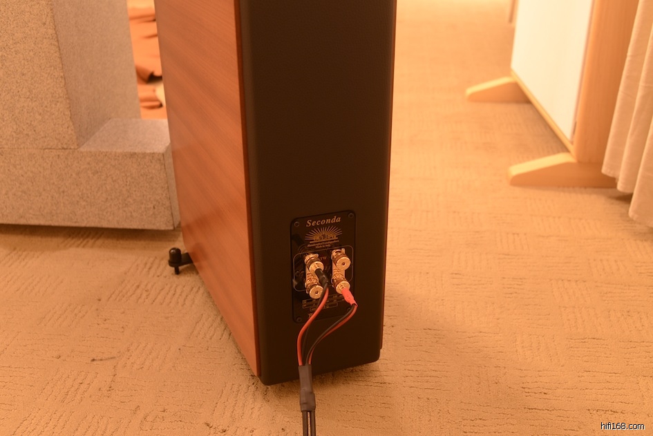Seconda的镀金喇叭端子特别的大,因为大,所以特别好用,锁起来也特别的稳,不用担心喇叭线会有脱落。Seconda的脚钉与一般的音箱不一样,它的2个长型的铁片是装在后方,2个有螺帽的脚钉是要锁在上面,而另外2颗没有螺帽的脚钉则是直接锁在音箱的底板上,不同于一般的脚钉是锁在铁片上面。特殊的脚钉也是经过精心的设计,厂商特别提示二只音箱在水平调节时,底部脚钉与后面铁架脚钉调准高低不同都会得到不一样的声音表现。
