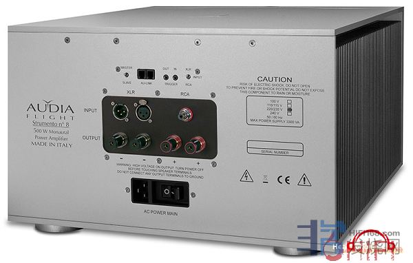 Audia Flight歌匠STRUMENTO N°8(乐器8号)单声道后级从输入到输出级皆采用全平衡线路结构、并选用了精挑细选的高级元件,每声道之中各自用上了数十枚晶体功率管,并配备了具超低阻抗值的电源供应系统,以及用上了电脑级的电容器(仅针对主电源供应部分的容量就高达320000微法拉),且电源供应部份更特别设立了12组电源供应,而特殊印刷电路板表面更选用了高纯度铜迹和铜导线作讯号传送和连系,每声道的重量级的供电部份,各自采用了一只数千VA特殊双重屏蔽音响专用的变压器来作为骨干组成,并附以超高速整流器为全机带来极其稳定的供电,从而使得STRUMENTO N°8于8欧姆负载时,可提供额定的500瓦功率输出、4欧负载输出1000W、2欧负载可输出2000W……提供0.3 Hz-1 MHz的超宽频带、阻尼係數(8歐姆)> 1000的最佳精度、超强能量和速度、超低失真的功率放大输出驱动,可以驱动任何扬声器以获得完美的音乐回放......等等。