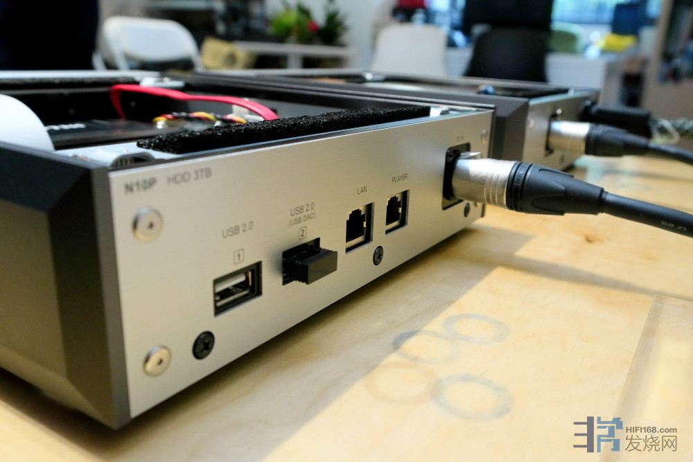 这就是这次发表会的主角之⼀,N100⾳乐专用网络硬盘,从外观上可以看到它的整个操作界面延续N1系列,所以会使用N1系列就会用N100(与N10),内建2.5吋的2TB传统硬盘,内部同样采用HS-S2抑振,不过电源使用的是跟D100/E100⼀样的外接式交换式电源(Adapter)。如果电源的问题会困扰⽤家,上⾯上有很多他厂推出的线性电源可以升级。▲