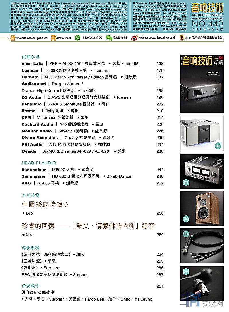 今期封面專題由梁錦暉、馬田、Stephen評論Soulution 330合併式放大器,鍾啟源走訪Asia Theatre 2.0全新角度下的壹號影院,馬田初訪神曲工作室 Divin Laboratory。本月特稿:令人難忘的 Wilson Audio WAMM Master Chronosonic 展示會、Leo 自述音樂音響之路、余昭科分享珍貴的回憶 ——「羅文.情繫佛羅內斯」錄音。其他評論文章包括:emm Labs PRE + MTRX2前、後級放大器、 Luxman L-509X旗艦合併擴音機 、 Harbeth M30.2 40th Anniversary Edition揚聲器 、Audioquest Dragon Source / Dragon High-Current電源線、DS Audio DS-W2光電唱頭與唱頭放大器組合、Penaudio SARA S Signature揚聲器、Entreq Infinity地線、CFM Melodious純銀線材、 Monitor Audio Silver 50揚聲器 、PSI Audio A17-M有源監聽揚聲器 、Cocktail Audio X45數碼播放器、Sennheiser IE800S耳機 、AKG N5005耳機....,詳細內容請參閱目錄。