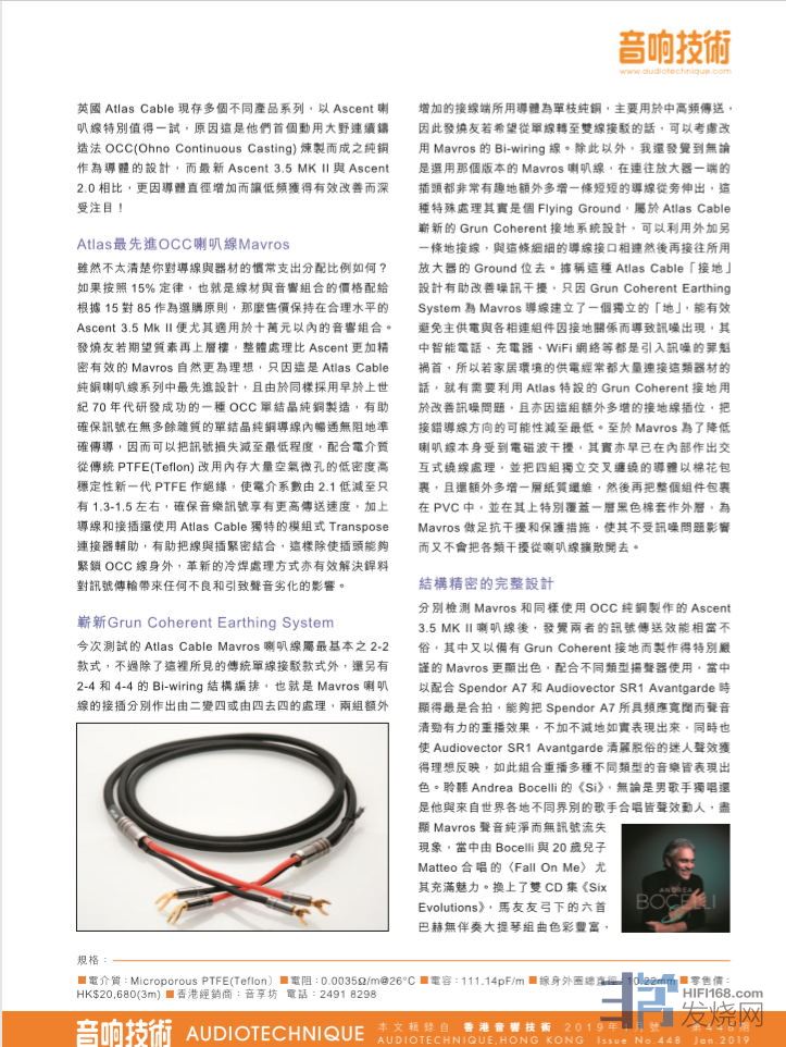 为了杜绝讯噪从讯号传送过程中引入音响系统当中,Atlas Mavros喇叭线除设有多项抑减噪音的措施外,更特为针对高低频传送而可以把内部四组采用以Atsumi Ohno 教授名字命名的高纯度单晶OCC铜导线分为两组,其中3.02mm2的多芯线用于低频传送而另一组粗度为1.77mm2的单枝OCC铜线则用于高频传送,配合设计独特而有效的Grun Coherent接地系统,精密有效的结构使这次配合所用音响组合的全频表现得和谐平直,加上全面考虑到Bi-Wiring用家的实际需要而推出2-2、2-4和4-4三个款式,中性自然而没有明显音染的声音,更是Atlas Mavros 特别值得选用的原因!
