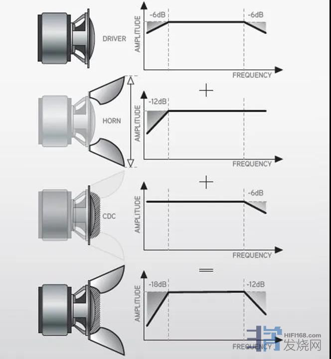没有分频器,单元直接接受来自功放的音乐信号电流,既避免了分频器无端消耗了功放输出的电流,也避免了分频器必然会带来的失真。喇叭花所有的中音单元都没有使用传统的功率分频。取而代之的是用号角与单元本身的机械分频。号角的开口大小与深度决定了号角的低频下潜(这也就是市面上极少有低频号角的缘故,要有低频下潜越深就需要号角越大);自家设计的单元可以在设计之初就确定陡降的频段;号角与单元衔接处特别设计了一个空腔,在严密的科学计算后可以干净地切掉无用的高频。最后一个没有分频器却有分频点(170Hz和2000Hz)的中音就达成了,这就是喇叭花的专利技术CDC机械分频技术。