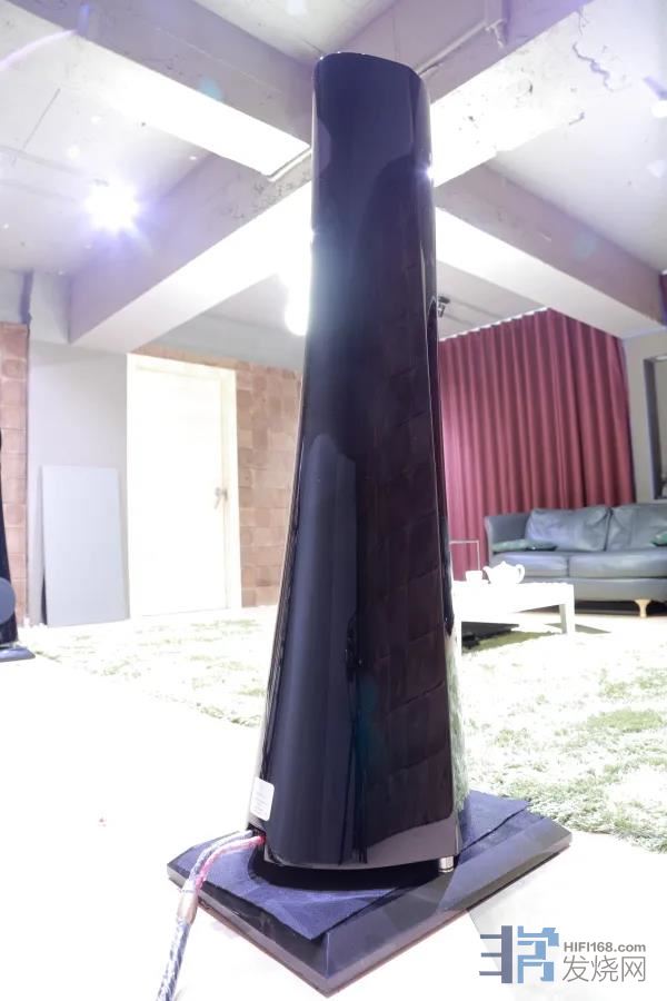 为了要维持YB瘦高圆滑的外观线条,低音单体不能摆放在正面,所以这个8吋铝合金振膜低音单体,摆放在喇叭侧边。要注意左右喇叭的位置,两个低音单体其实是向内面对面摆放的,所以左右有别。我在慕尼黑音响展看到YB时,原厂就是让低音向内摆放,来极品音响试听时,他们也是这么摆,应该是原厂的建议。这两个8吋低音单体加持下,形体不算大的YB,低频延伸可以到30Hz。