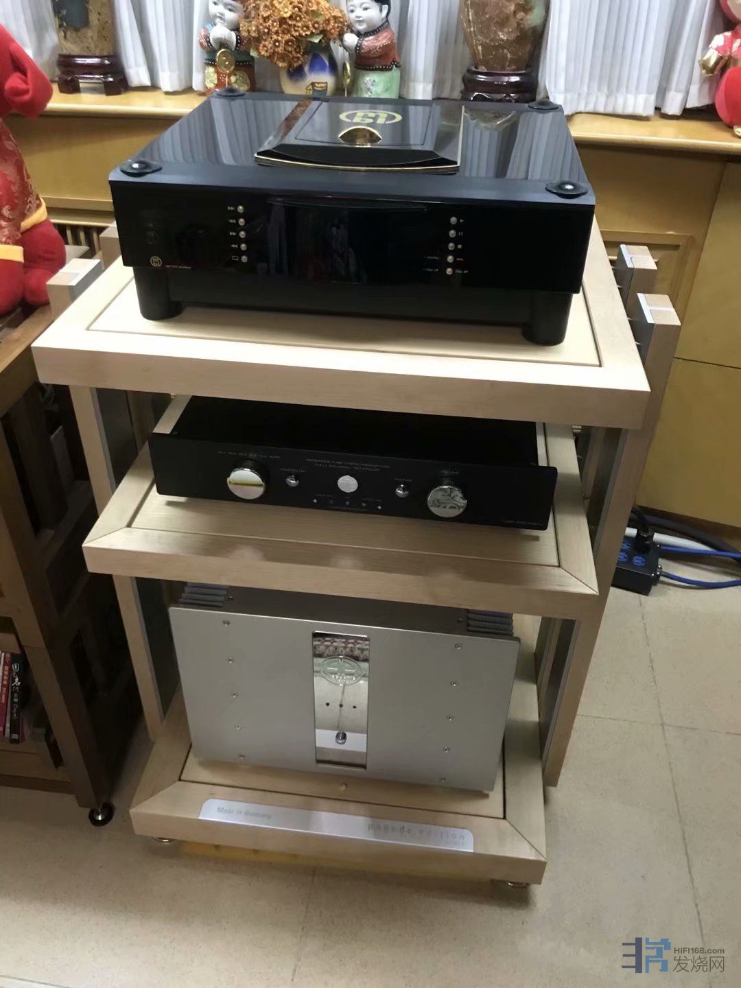 青岛朋友是在我们的建议下,上了一套柏林之声旗舰前后级系统,需要两套三层机架,朋友慕总在广州也看了很多机架,HRS、高丘、架宗、NSR、驾皇、CMS、范天辰、Creaktiv等等,这些高级机架好是好,价值也不菲,有接近10万一套的,更有超过10万以上的,可是外观都不够称心如意,粗大的金属柱子,单调冰冷的黑色或银色,视觉冲击力过于强烈,导致讲究并追求完美的朋友慕总都一一排除了,只有外观更细致精美、更暖色调的德国FE枫木原色机架获得朋友的认可,在金属和实木的选择中,完全倾向了更能融入家居的实木,本身器材柏林之声旗舰前后级就有强烈耀眼的金属外观视觉冲击力,加上实木机架暖色调的搭配,精金配美玉,相得益彰。