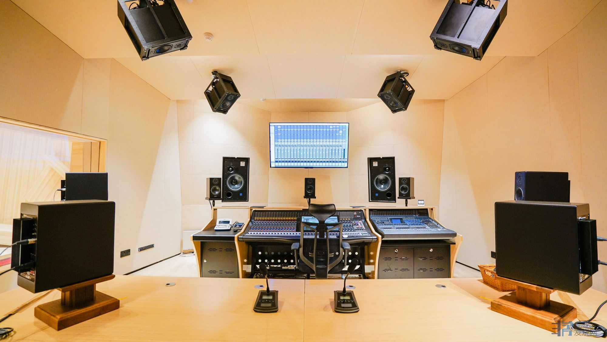 广州大剧院梅兰音乐录音棚总投入约一千多万,录音控制室配置世界顶级的英国AMS NEVE GENESYS调音台,立体声主监听音箱是业界翘楚——英国ATC SCM150ASL PRO 。