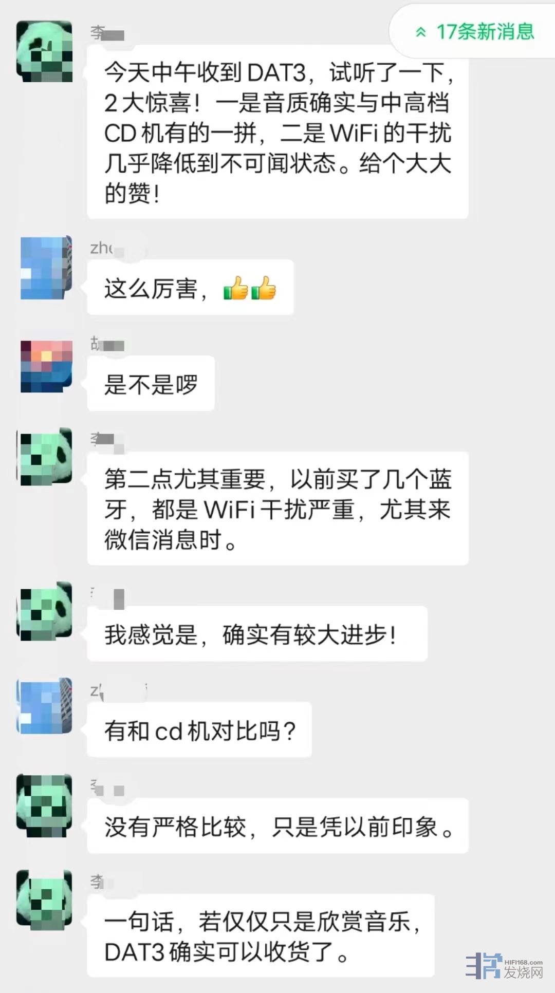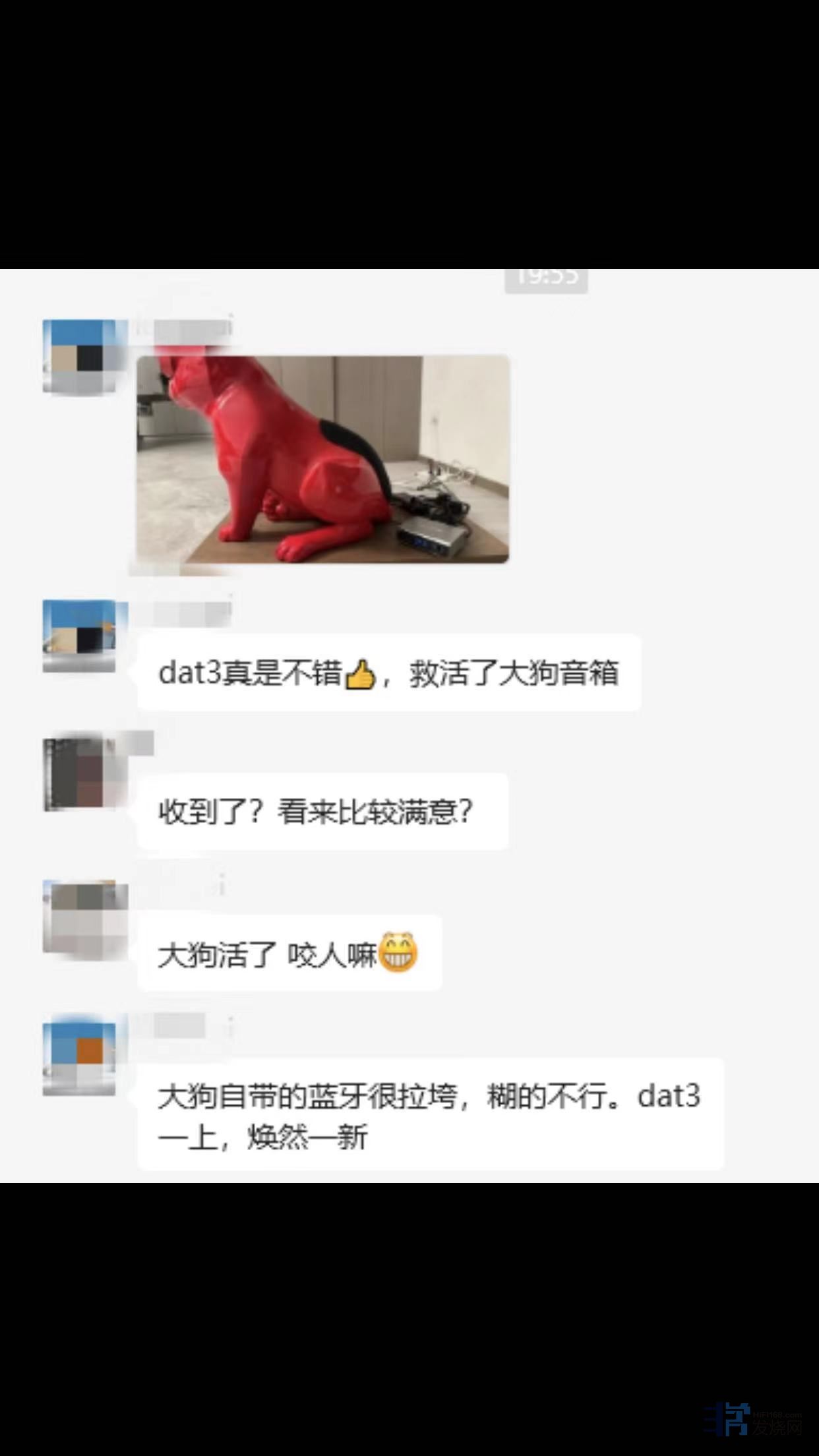 在群内,一位朋友的音箱外形颇具特色,被称为大狗音箱。其他群友对 DAT3 的实际使用体验也充满好奇,紧接着便询问其是否满意。这位朋友表示,大狗自带的蓝牙效果不佳,较为模糊,但当使用 DAT3 后,却有了焕然一新的感觉。“焕然一新”这个评价无疑是相当高的。