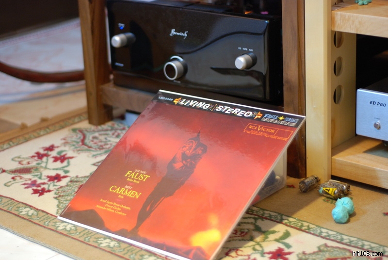 由于长假好几天没开机,整个系统一点状态都没有,无精打采的。十多年来的发烧经验告诉我,系统没状态时最容易测试线材、附件的实力!这个TG垫板使用非常简单,直接把它塞进器材架与器材之间即可。我一个人几分钟就能搞定,放上一张平时听得最多的RCA名盘 《浮士德、卡门》LP,落针、开声。。。