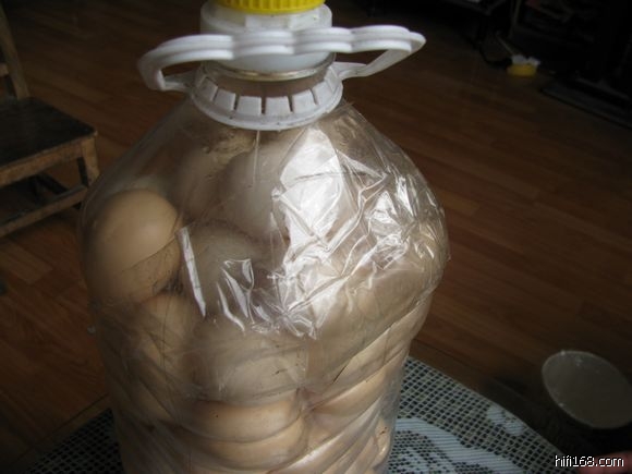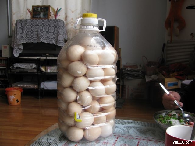哈哈,7楼的朋友说对了,就是把油桶上开一个口子,装进土鸡蛋后用透明胶封的,老婆说她上公共汽车时很多人都觉得奇怪。。。哈哈。。。。。