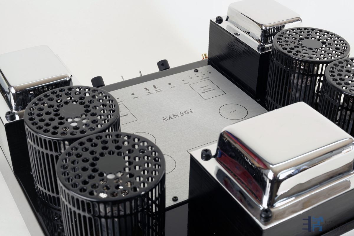 EAR 861配备了大型输出变压器,每一个手工制作的输出变压器重量约5公斤,放大线路采用无负回授设计,从输入到输出,采用全平衡推挽放大,所以EAR 861 难得的同时出现了平衡与非平衡端子。与EAR 859相同,都是直接交连,避免讯号路径额外电子零件的音染。