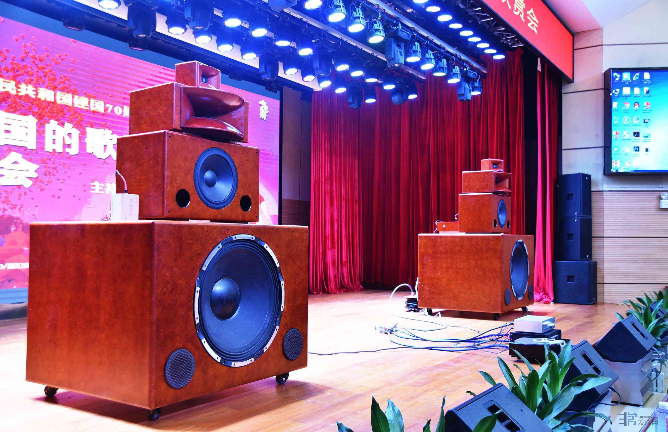 本场活动采用中国号角王李齐车最新设计制作的音响系统,以罕见的34吋超大低音单元为主,配合号角单元、陶瓷超高单元等,将4个独立箱体堆叠成一个全频音箱,一对音箱有8个独立单元。