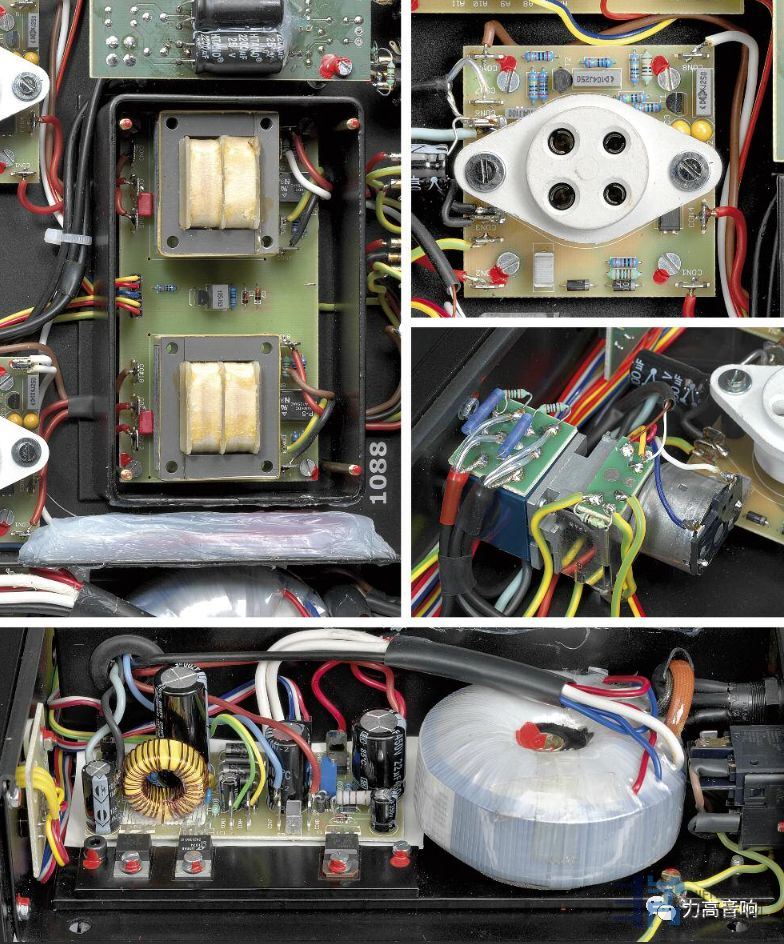 特写:输入级变压器和JFET管,双声道输出变压器(屏蔽)并与KR45管实现绝佳耦合、KR45管座以及ALPS音量控制