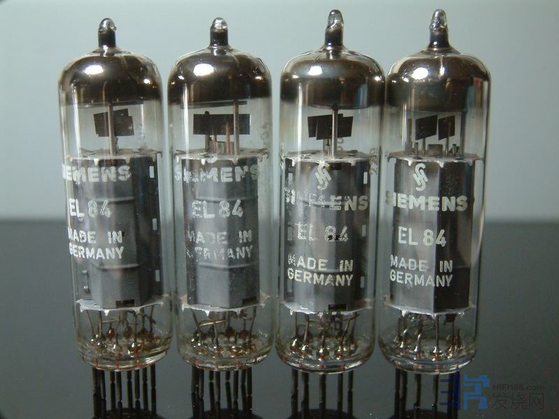 6BQ5/EL84/6P14:管脚为小九脚,单管单端输出功率与6V6差不多,也是4W左右,推挽功率10W左右,EL84是五极管结构, 所以它的高频会比6V6更加飘逸,但是低频又没有束射管那么扎实。EL84独特的音色是许多厂机喜欢采用的原因。MANLEY的STINGRAY II魔鬼鱼胆机一个声道就用了2对EL84做并联推挽,能提供32W(UL模式)功率输出。