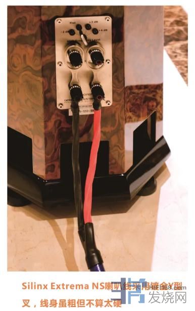 Silinx Extrema NS喇叭线采用正负通道各三条导体组成正负通道的方式,插头则采用纯铜镀金Y型叉,提供稳固可靠的连接。其实原厂还提供香蕉插版本的,有需求的玩家可以和总代理订货。这两种连接端子有什么区别呢?经验而言Y型叉无需考虑弹性,可以采用导电性更好的碲铜或铍铜制造,声音更好。而香蕉插则需要考虑持久使用的弹性和抗弯折能力,因此导体需使用物理特性更好的合金铜,声音表现多数不如Y型叉。