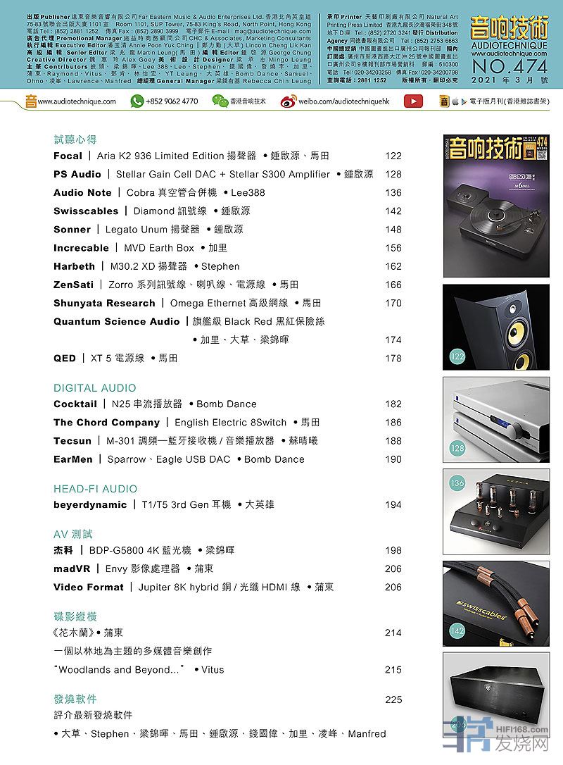 今期封面专题由披头、马田、大草评论SMEModel 6唱盘。其他评论文章包括:Focal Aria K2 936 Limited Edition扬声器、PS Audio Stellar Gain Cell DAC + Stellar S300 Amplifier、Audio Note Cobra真空管合并机、Swisscables Diamond讯号线 、Sonner Legato Unum扬声器、Increcable MVD Earth Box 、Harbeth M30.2XD扬声器 、ZenSati Zorro 系列讯号线、喇叭线、电源线 、Shunyata Research Omega Ethernet高级网线、Quantum Science Audio 旗舰级Black Red 黑红保险丝 、QED XT 5 电源线 、Cocktail N25串流播放器、The Chord Company EnglishElectric 8Switch 、Tecsun M-301调频—蓝牙接收机/音乐播放器、EarMen Sparrow、Eagle USB DAC 、beyerdynamic T1/T5 3rdGen耳机、杰科 BDP-G5800 4K蓝光机 、madVR Envy 图像处理器、 Video Format Jupiter 8Khybrid铜/光纤HDMI 线 ....,详细内容请参阅目录。