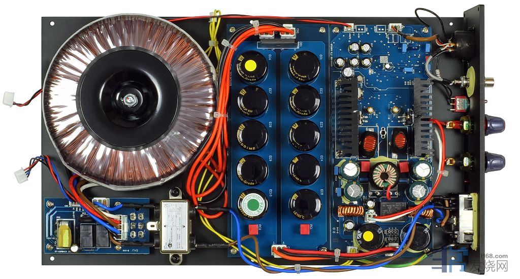 NuPrime ST-10和ST-10M是密切相关的:前者---立体声,后者---单声道。电源是最引人注目的特征。许多D类放大器都伴随着开关电源,而NuPrime的工程师,反正不是第一次,选择了经典的线性电源。一个可观的300VA环形变压器。由于外壳的高度较低,环牛非常平整,但其直径却令人印象深刻。在这里描述的两个型号中,机箱内部的其余部分被印刷电路板所占据。在ST-10中,这些当然是两个独立的通道;而在ST-10M中,相同的放大器用于一个通道。有趣的是,电容都饰有NuPrime的标志。至于放大电路本身,它是一个脉冲开关设计,频率相当高,为600千赫。功率上ST-10在8Ω时每声道提供150瓦,ST-10M提供230瓦,但制造商首先强调的是阻尼系数(400),和比前一型号更低的本底噪声。无论选择哪种方案,我们面对的都是一个能够驱动非常苛刻的扬声器的放大器。