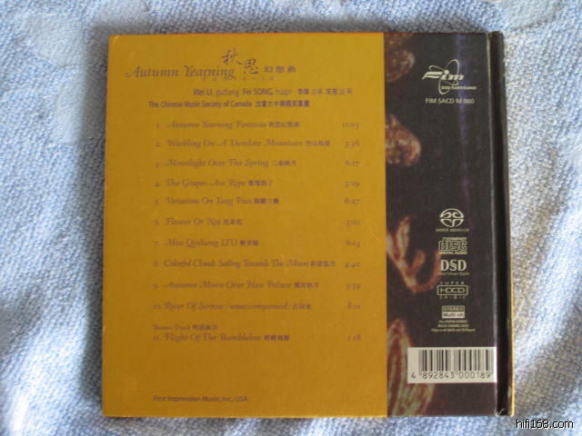 当初是经一个卖CD的朋友介绍去买的,当然,当时买的是老翻;后来听着听着,觉得真的不错,演录俱佳,就托一个朋友在HK买了一张正版!!这张正版可贵呢,当时的收入也只是1000来块钱,这张正版可要我了六分之一的工资啊!不过也好,这个应该是现在中乐迷很多人想得到的SACD初版。