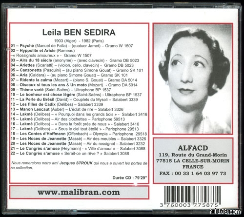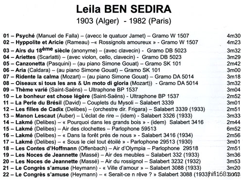 法国花腔女高音Leïla Ben Sédira 1903年2月17日出生于Algiers((阿尔及利亚首都,曾为法国所占),1982年6月1日在巴黎去世,早年是在巴黎音乐学院学习钢琴,老师是大名鼎鼎的Lazare Levy(1882-1964),不过她声音上的天赋很快被发现更加杰出,遂跟随Jeanne Campredon(1884-19??)学习声乐,她为人极为低调,也不喜欢在歌剧院演唱,她倾向于音乐会的演出,虽然所处的时代是录音技术发达的年代,留下的录音(至少已经发行的)非常少,她所擅长的都是法国曲目,尤其是Lakme,她绝对是该曲目的最杰出演出者之一,听她1929年的 Bell song,极为朴素、甘美,对比两外两位Lakme的杰出演绎者Mado Robin和Lily Pons,可以发现那些眩目的花腔统统不见,声音最大程度上为音乐服务。