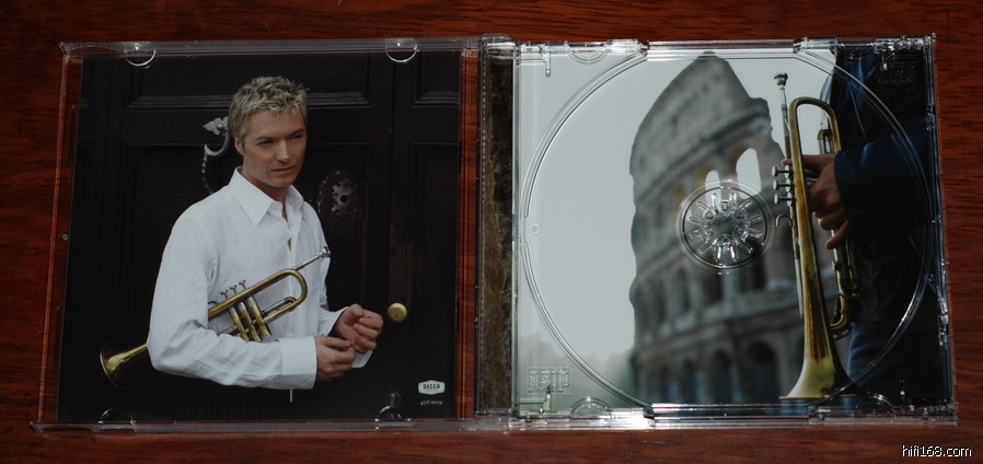 但我买到的是香港制碟,DECCA公司出的,编号为:4780029DH 由于网站唱片架里已有详细介绍我就不重复.该碟给我的印象是小号的声音非常动听,音乐节奏很慢,小号手对声音,气息的控制非常好.某些曲子听着听着,想到的情景是:一对恋人相依着坐在岩石上(剪影),眺望日落.那圆圆的昏黄的太阳渐渐下落,慢慢隐藏着它的圆脸.周围的晚霞被照得很红,很艳,而且色彩从太阳的周边向远渐变,淡化.场景温馨而浪漫.个人喜欢它的曲目有第10首"圣母玛利亚",一把竖琴,还有人声的合唱作背景,他们和主角小号一起将此曲表现得非常安详,神圣,还有"内心的宁静".其他喜欢的还有第3,7,12首.