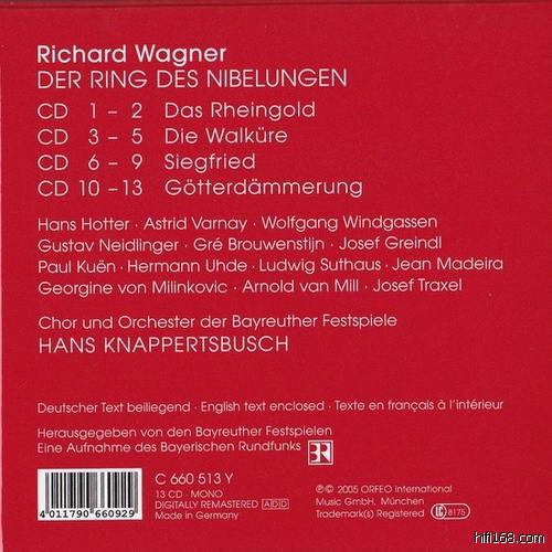 Aug 8, Das Rheingold - Malaniuk, Ilosvay, Falcon, Hotter, Witte, Neidlinger, Küen, Weber, Greindl, Uhde, Stolze – Krauss issued on CD by Orfeo C809113R and by Opera D'Oro OPD1500 and by Archipel ARPCD0250 and by Urania on RM11906 available for download from Pristine Audio Aug 9, Die Walküre - Varnay, Resnik, Malaniuk, Vinay, Hotter, Greindl – Krauss issued on CD by Orfeo C809113R and by Opera D'Oro OPD1500 and by Archipel ARPCD0250 available for download from Pristine Audio Aug 10, Siegfried - Varnay, Ilosvay, Streich, Windgassen, Hotter, Kuën, Neidlinger, Greindl – Krauss issued on CD by Orfeo C809113R and by Opera D'Oro OPD1500 and by Archipel ARPCD0250 available for download from Pristine Audio Aug 12, Götterdämmerung - Varnay, Hinsch-Gröndahl, Malaniuk, Windgassen, Greindl, Uhde, Neidlinger – Krauss issued on CD by Orfeo C809113R and by Opera D'Oro OPD1500 and by Archipel ARPCD0250 available for download from Pristine Audio