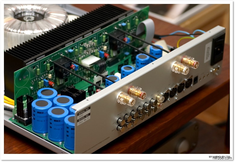 当打开本机箱顶盖时,最令人感觉到瞩目惊讶的,就是那只没有金属罩密封的超级巨型环状变压器,所拥有的直径竟然达到150毫米,设置于箱体的前方位置;而本机的放大线路则集中在机箱的后半部,设计有条不紊,用料精简,功率管及电路板排列紧凑,就连电流输出级也用4条金属杆直连WBT喇叭接线柱,显然对争取最短线路有所助益,尽量减低讯号的干扰。至于设置于箱体正中央的冀翅型铝质散热器,就能把环牛与电路板独立有效地以区域性分隔,能够消除或杜绝双方所诱发的磁场和电波产生互相干扰。最新合并式放大器Thor Mk II,首次突破性采用MOSFET(金属氧化物半导体场效应晶体管)单端式放大线路作为输入级,至于输出级则采用了16枚高效率和完全对应的MOSFET作并联放大线路,并将这两种不同效用特性的输出输入放大电路处理完全独立地在一个放大器内同时运作。至于本机供电部份的设计及用料,更是非常罕有地采用效率高兼且低磁漏的1,800 VA巨型环状变压器,效果表现卓越,但制作程序较为繁琐,成本也比较高,理应只会在拥有强劲输出的高档前,后级功率放大器才会使用,但现时已为本机所取用,实在令用家雀跃万分;再配合采用电容量台共高达80,000μF的优质电容,构成多重滤波的供电核心系统,使本机具有令人叹为观止的超级供电能力,输出功率能达到每声道连续性的150w x 2(8Ω)强劲驱动力,故驱动一般任何类型的扬声器都能够应付自如,重播演绎的能力同样是游刃有余。
