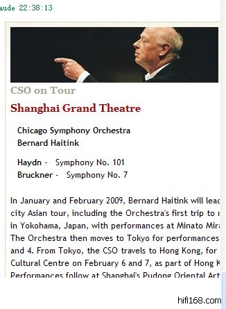 In January and February 2009, Bernard Haitink will lead the CSO in a 10-concert, five-city Asian tour, including the Orchestra's first trip to mainland China. The tour begins in Yokohama, Japan, with performances at Minato Mirai Hall on Saturday, January 31. The Orchestra then moves to Tokyo for performances at Suntory Hall on February 1, 3 and 4. From Tokyo, the CSO travels to Hong Kong, for performances at the Hong Kong Cultural Centre on February 6 and 7, as part of Hong Kong's annual Arts Festival. Performances follow at Shanghai's Pudong Oriental Arts Center on February 10 and 11, and the tour concludes with two concerts at Beijing's National Center for the Performing Arts on February 13 and 14.