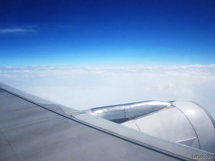 飞机在距地六、七千米高空的云海上翱翔,我则无聊地拿着相机凭窗抓拍。透过舷窗,白云蓝天。朵朵团团的白云连绵起伏,汇成莽莽云海一望无际。望着深邃的蓝天,真希冀这时的天空突然出现