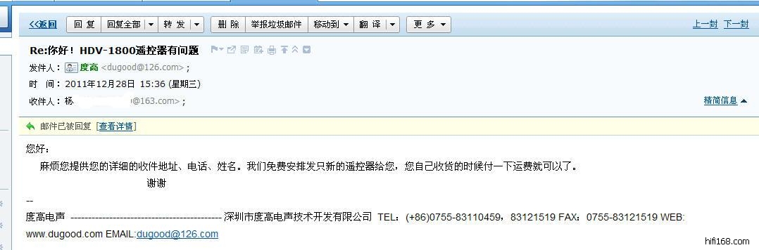 话说3年前,买了台度高的1800 DVD,现在遥控器坏了,去电邮给度高,人家免费邮寄来一个新的。表扬下。