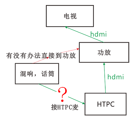 htpc接线 htpc用hdmi-->功放hdmi-->电视 那混响如何接?