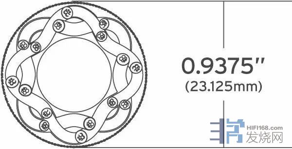 Monocle-X 在线径方面达到了 23.125 mm,这对于普通的“绞合式”设计的喇叭线材,属于粗壮的了,但比之前的 XL 则幼细了一点!当然,这么粗壮的线材并非意指当中有着粗壮的金属导体,相反是正如上文所言,当中隐藏着“缠绕”式制作设计,XL 为 24 股导体,而X则为 16 股缠绕布局,这些绞合的线材导体采用了独特的 Vari Strnd 高纯度单芯铜,当中每股导体线规为2×9AWG(6.63mm2),CP 并联电容为 789PF/m,LS 串联电感为0.946μH/m,RDC直流环路电阻为0.036Ω/m ,可见专业厂家还是喜欢用资料说话。