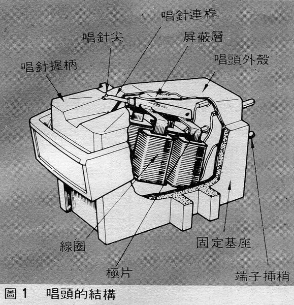 唱针连杆的后半部无法看到,因为它是支持在极片(pole piece)中的,在MM式唱头中,唱针连杆的后端附着有一块磁铁,如图2所示,中间部分的阻尼尖有杠杆作用的支持点、以及唱针连杆动作的控制点两种作用,上述各单元的组合就成为唱头的振动系统了。
