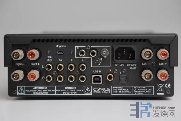 Cyrus One HD比Cyrus One多了USB、同轴、光纤的数字输入。除了RCA高电平模拟输入外,还有一组MM唱头放大,并有一组前级输出。如果想玩双扩大机或双线连接,他有两组音箱端子可用,使用上变化多端。