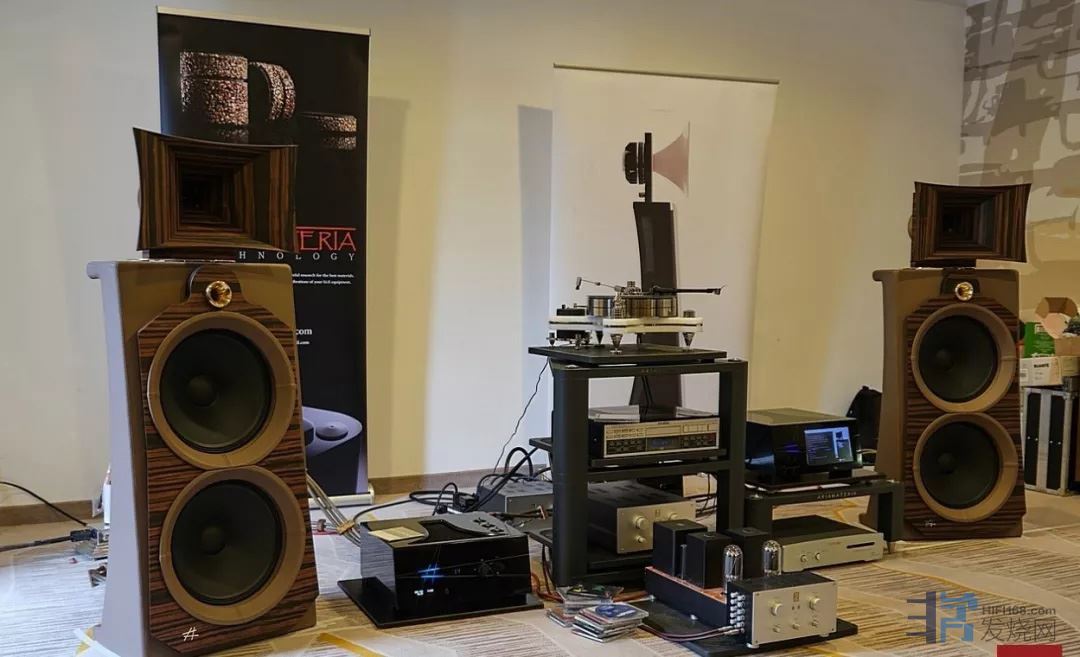现场这对外形优雅别具一格(别具一格:另有一种独特的风格。)的音箱无论是搭配Kondo Ongaku功放还是Diesis原厂的Corian-clad Evento 20-11胆前石后混合合并功放,在播放高格式音乐母带时声音都鲜活华丽、声场宏大壮观,低音深沉柔和而宽松。这对Diesis旗舰音箱采用两只15英寸英寸偶极型低音发声单元与中高音号角压缩单元融合为一体的独创性设计。但观展惊喜之余不无遗憾的是,由于这对旗舰音箱体积太大,无法放在我的家里使用试听。