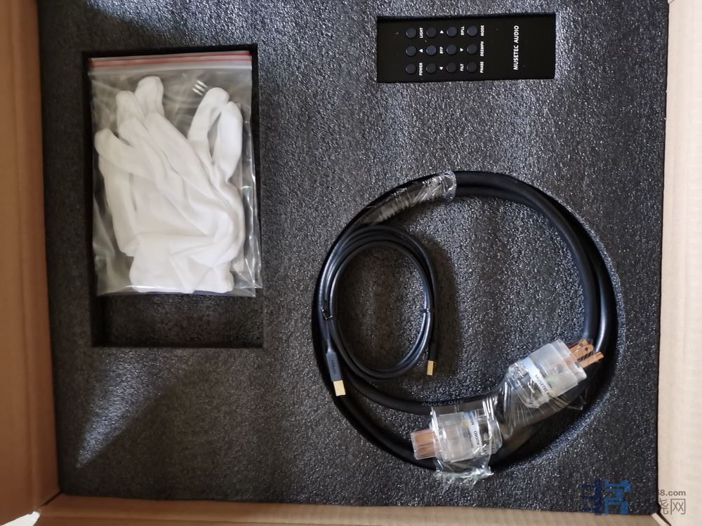 上层是附件:免费赠送的电源线(没有使用,估计马马虎虎,应该比沐声DIY的198元古河线基电源线强点)、USB线(鸡线)、遥控器(遥控器的外观、按钮、手感都比以前有相当大的进步,不错!已装电池,可直接使用,很为用户着想)、优盘(32G,内装电子说明书与USB驱动程序),还有一把2MM的内六角螺丝刀(遥控器装卸电池使用,很精致),再有一双白手套。