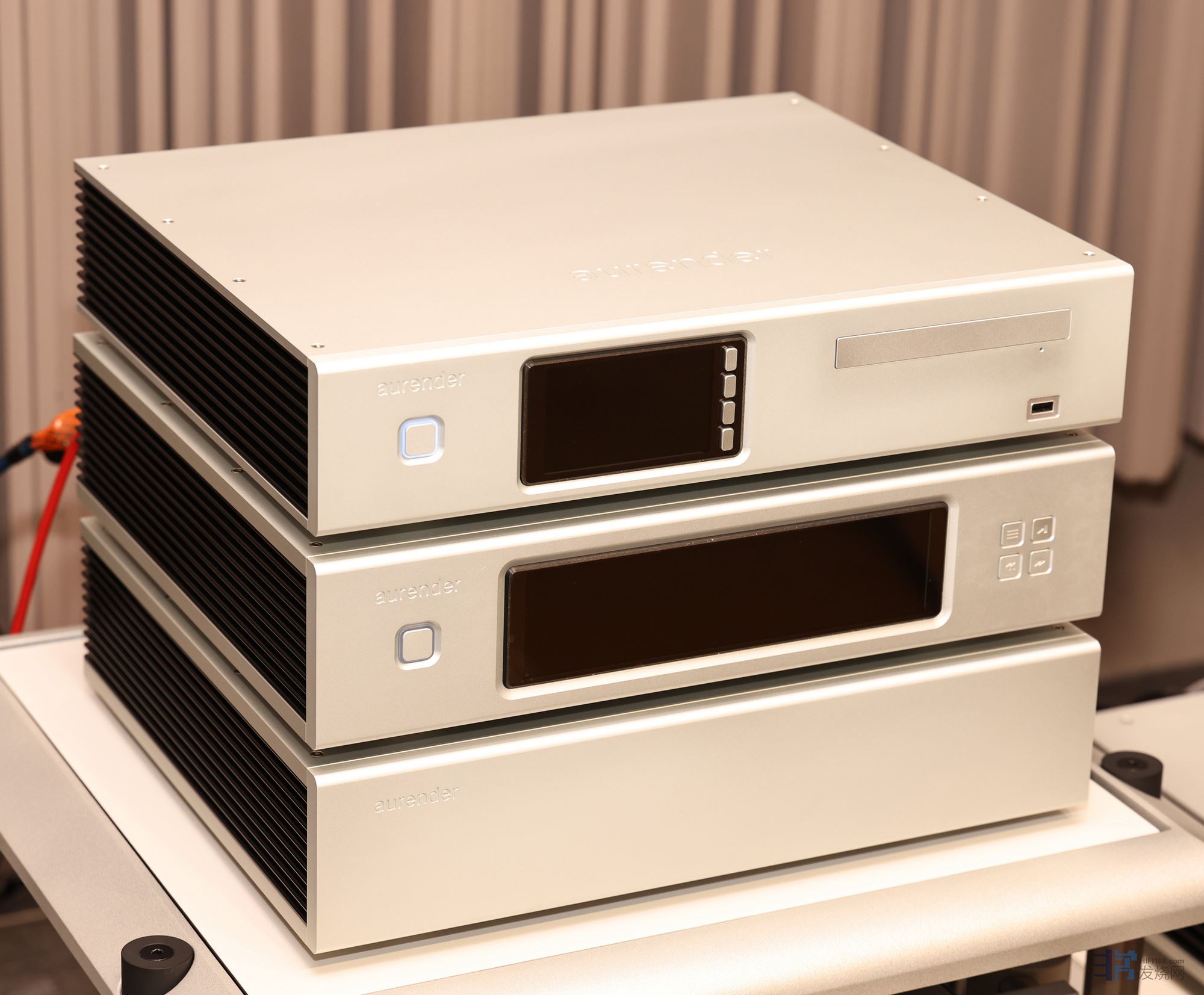 Aurender N30(底下两台)是一台旗舰分体数字转盘,N30有两个机箱,其中有显示荧幕的那台是容易产生干扰的部分,当中包含了电源供应、CPU 中央处理器、控制系统、储存、网络输入…等部分。
