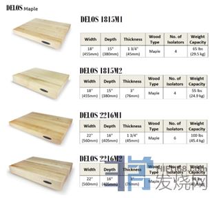 DELOS避震层板一共有两个版本,包括Maple(枫木)和Walnut(胡桃木),两种木料之下又针对不同的尺寸、厚度和隔离层进行细分,Maple包括1815M1\1815M2\2216M1\2216M2和Walnut包括1815W1\1815W2\2216W1\2216W2。厚度越厚的DELOS则有着更大的质量,同时会令振动和共振起到更有效的抑制。