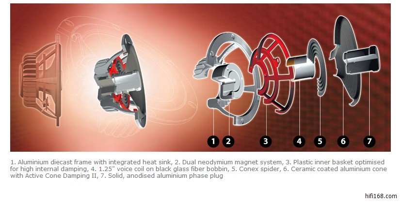 其中很关键的两点,一是振膜使用了陶瓷涂层的铝盆,铝盆一类硬质振膜单元一直是小弟很喜欢用的单元,而这个复合的陶瓷涂层铝盆,在保持质硬质轻的同时又获得很好的内阻尼,对降低音质、改善音色有很大的优势!二是使用了相位锥,对改善中频上段的相位和指向性也起到了很好的作用。下面是网上第三方对 VIRGO 25的测评