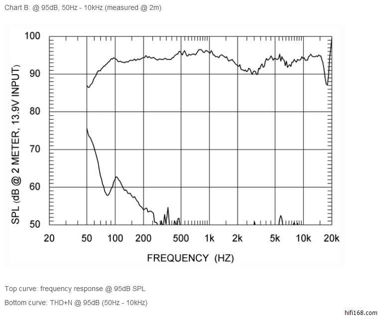 上图是该第三方网页给出的在响度95db下的失真情况,上面那条曲线上VIRGO 25的轴向频响,下面曲线是失真,可以看出此时200hz以上频段失真只有-45db,折合大约只有0.5%左右的失真(不少高价箱子早已1%以上了)。大家知道音乐的主旋律是由中频信号组成的,从200-1600hz 3个八度之间,几乎包括了所有乐器和人声的基频,是最重要的频段,而上述的这段由单独的中音单元负责且大音量下又能保持较低的失真,所以不少人都说Audio Physic的中频好是有原因的。