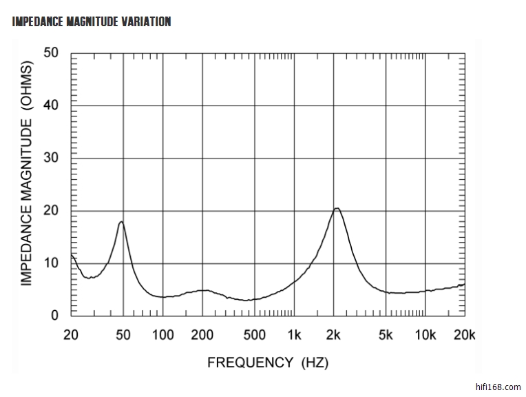 下图是第三方测量 VIRGO 25的阻抗曲线,从曲线看出,这个箱子的中-高声学分频点应该在2khz以下的。50hz处的阻抗看出,这箱子也利用了分频电路本身的谐振来加强了低频了,这也是飞星箱子低频量感和下潜都很足的原因之一。
